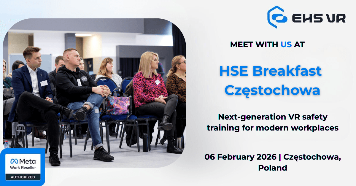HSE Breakfast to dedykowane wydarzenie networkingowe i wymiany wiedzy dla specjalistów ds. bezpieczeństwa i higieny pracy. Podczas HSE Breakfast w Częstochowie EHS VR zaprezentuje rozwiązania szkoleniowe BHP oparte na technologii VR oraz pokaże, w jaki sposób immersyjne symulacje wspierają skuteczną edukację w zakresie bezpieczeństwa i higieny pracy. Spotkaj ekspertów branżowych, doświadcz pokazów VR na żywo i wymień dobre praktyki w nieformalnej, śniadaniowej atmosferze.