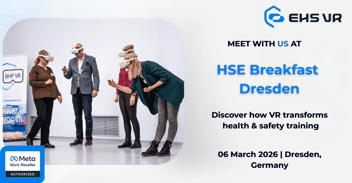 HSE Breakfast to ekskluzywne wydarzenie networkingowe i wymiany wiedzy dla specjalistów ds. bezpieczeństwa i higieny pracy. Podczas HSE Breakfast w Dreźnie EHS VR zaprezentuje rozwiązania szkoleniowe BHP nowej generacji w technologii VR oraz pokaże, jak immersyjne symulacje usprawniają praktyki w zakresie bezpieczeństwa i higieny pracy. Dołącz do ekspertów branżowych na pokazy VR na żywo, profesjonalne dyskusje oraz networking w swobodnej, śniadaniowej atmosferze.