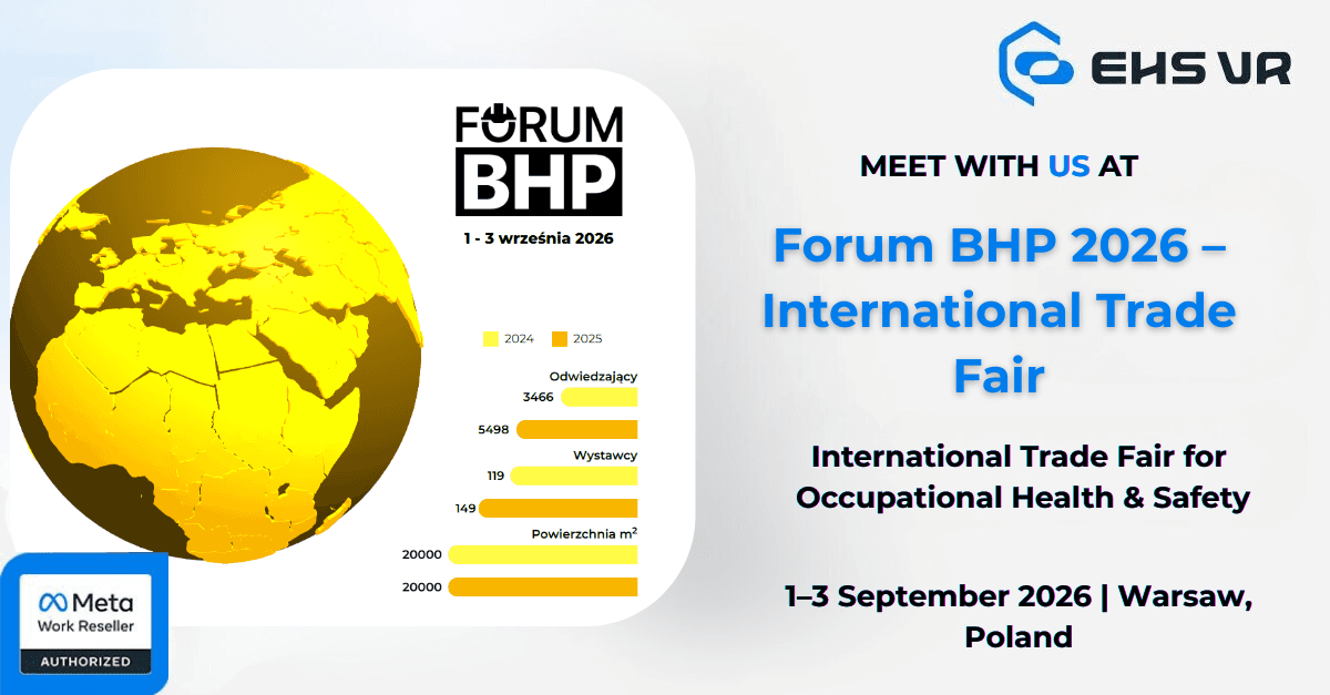 Forum BHP to międzynarodowe targi poświęcone rozwiązaniom z zakresu bezpieczeństwa i higieny pracy. Podczas Forum BHP 2026 w Warszawie EHS VR zaprezentuje rozwiązania szkoleniowe BHP nowej generacji w technologii VR, umożliwiając odwiedzającym doświadczenie immersyjnych symulacji w zakresie bezpieczeństwa pracy, świadomości ryzyka oraz reagowania w sytuacjach awaryjnych. Odwiedź nasze stoisko, aby przetestować scenariusze szkoleniowe oparte na VR i przekonać się, jak wirtualna rzeczywistość podnosi poziom edukacji w obszarze bezpieczeństwa.